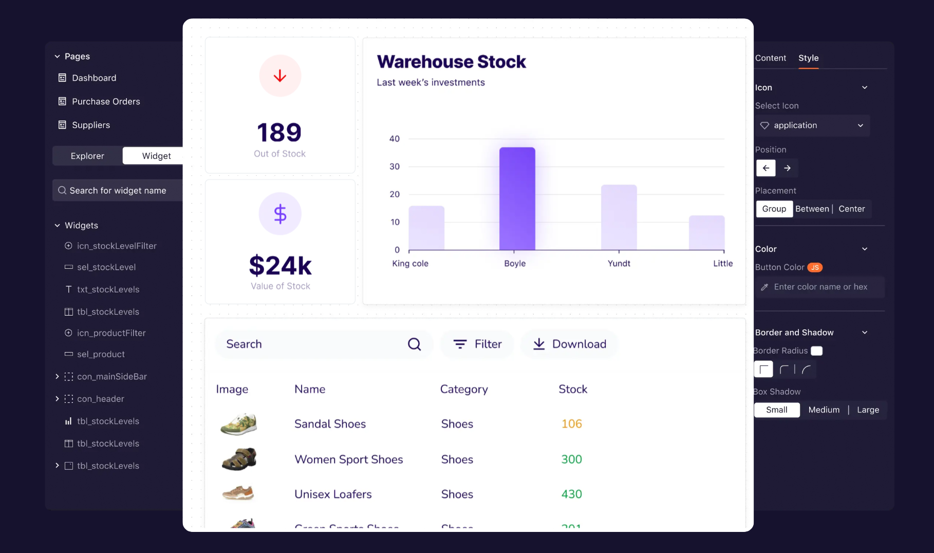 - Drag-and-drop UI builder, 40+ widgets