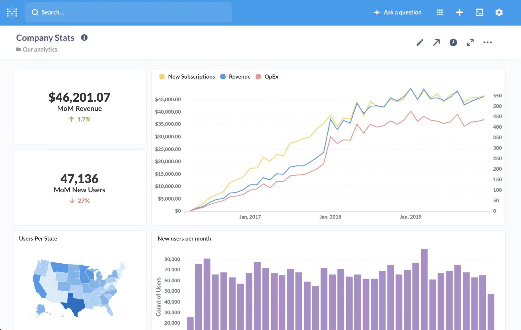 Metabase is an open-source business intelligence tool that makes analytics accessible to everyone in your company. With its user-friendly interface, you can explore data, create dashboards, and generate insights without needing extensive technical knowledge.