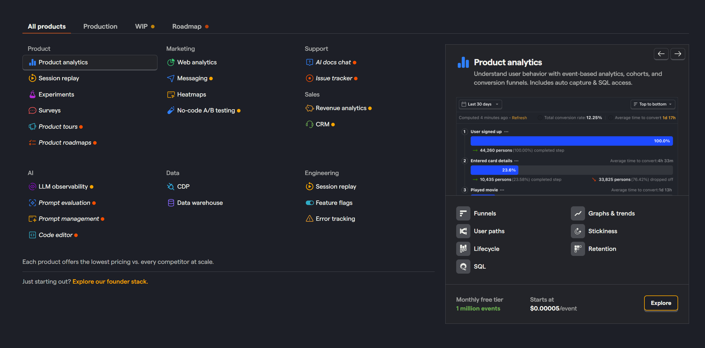 PostHog is a comprehensive platform designed to help you analyze, test, observe, and deploy new features in your product. It combines multiple tools into a single, cohesive system, making it easier for developers to build successful products without needing to integrate various disparate tools.
