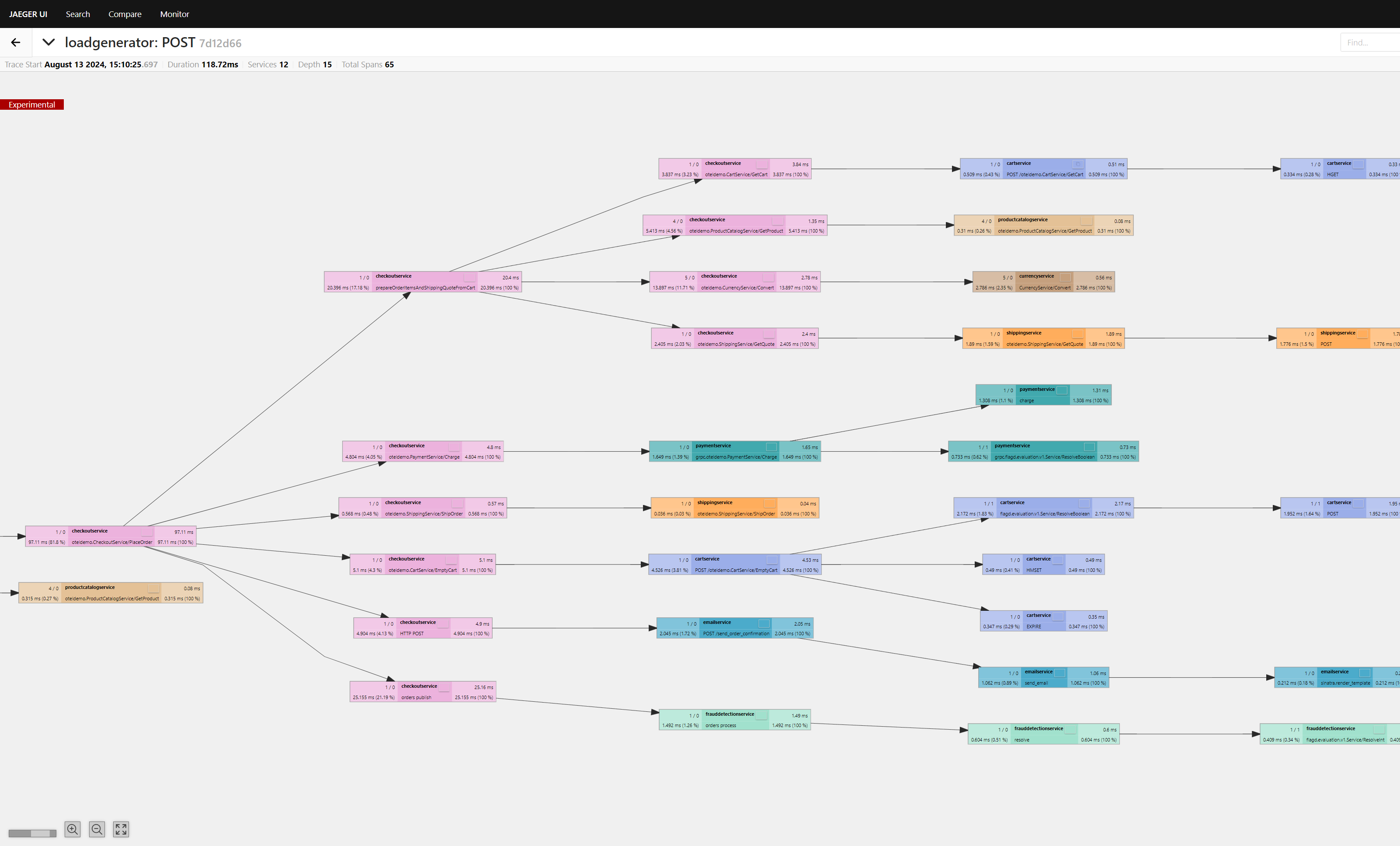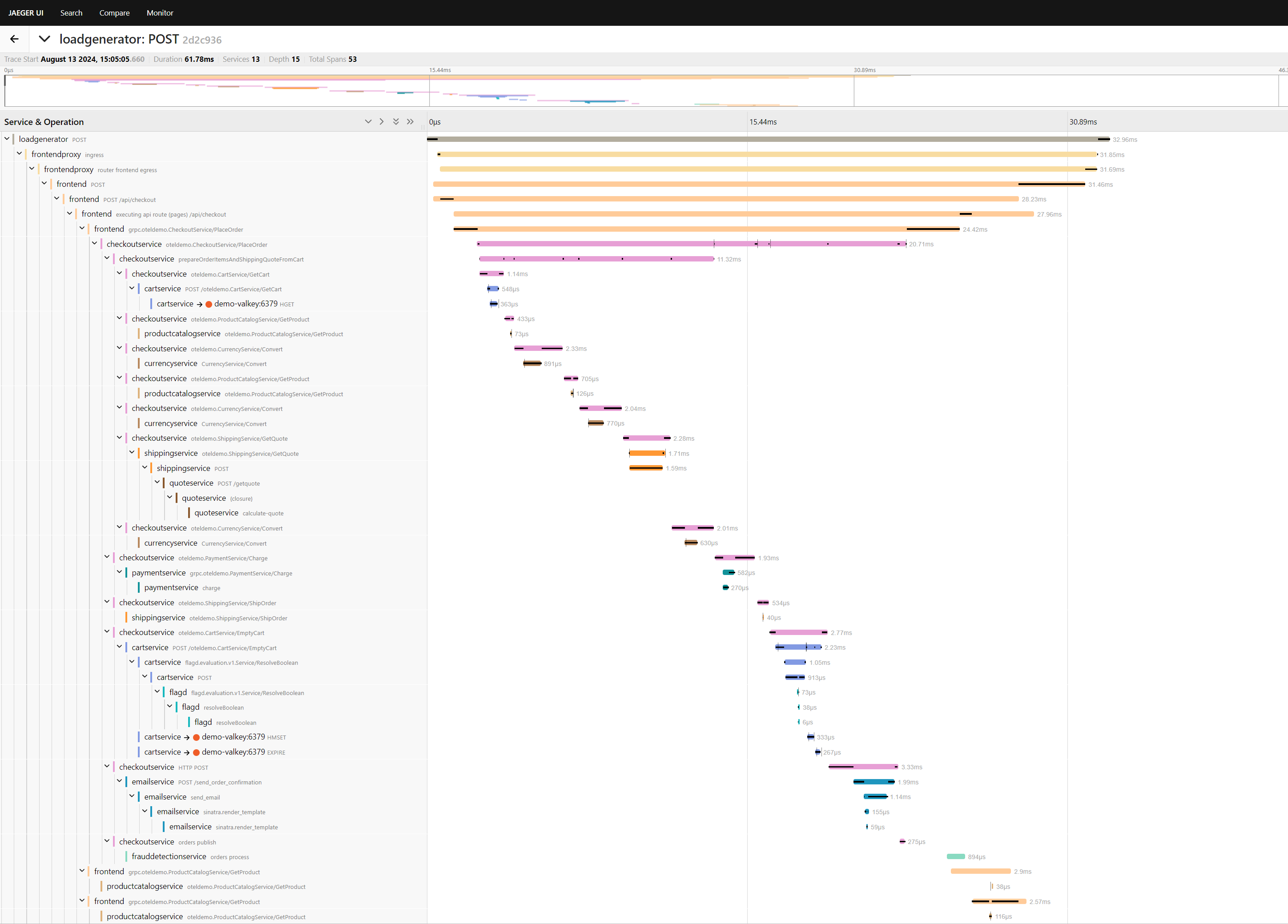 In the Jaeger UI, you can see the timeline of a request. This also shows you how much time the request spent in each service, which will show you the bottlenecks in your system.